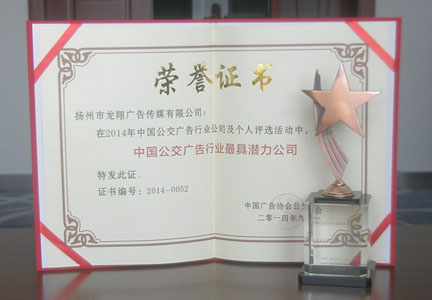 熱烈祝賀“揚州市龍翔廣告?zhèn)髅接邢薰尽痹?014年中國公交廣告行業(yè)公司及個人評選活動中,榮獲“中國公交廣告行業(yè)最具潛力公司”獎。